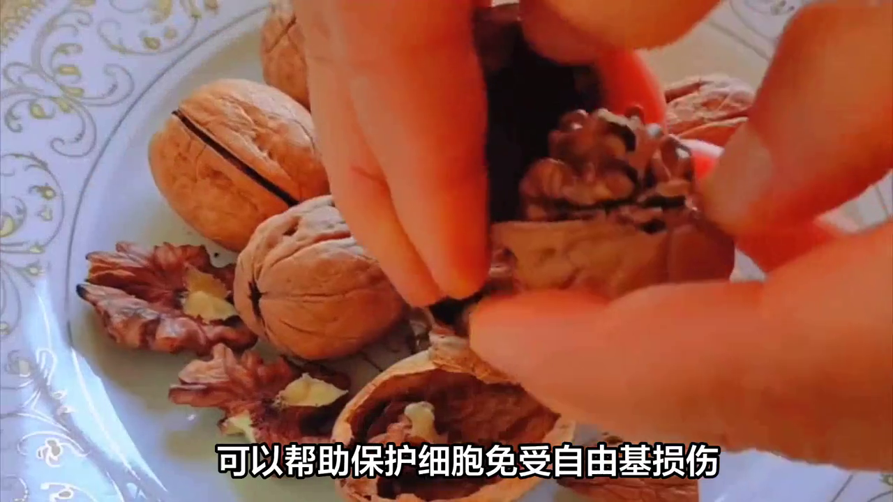 6.核桃——富含单不饱和脂肪、多不饱和脂肪、蛋白质、膳食纤维、维生素和矿物质,可以有效地降低胆固醇、控制血糖、促进消化和增加饱腹感。核桃中的抗氧化剂可以有效地保护细胞免受自由基的损害,从而延缓衰老。