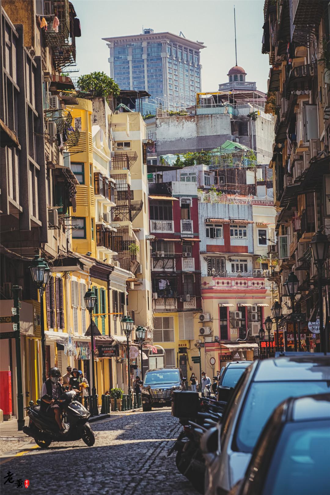 第二站继续坐车,目的地是东望洋街。来到这里的目的是完成一张网红拍摄机位。这里可以把新葡京和老城房屋同框,有一种时代交替的震撼感觉。拍摄的时候特别需要注意安全,因为可能会需要站在马路中间,一定注意观察过往车辆。个人建议,尽量用长焦取景,留少许街道陪衬,效果更佳。