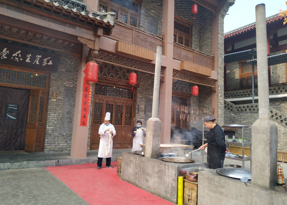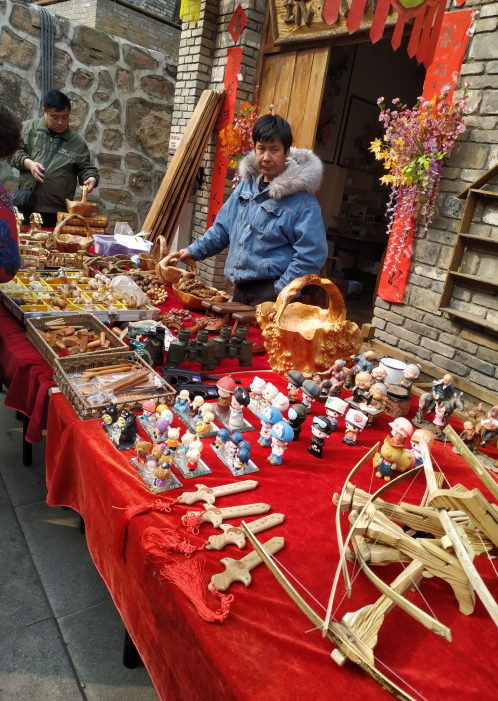 顺水沿谷前行,到达古镇广场,两层高的仿古建筑配上中国红的大红灯笼显得很热闹,灰砖灰瓦建筑为红崖书院,是南开大学的国学大师亲自主持的国学研学基地,国学讲堂常年授课,成为万千学子体验国学经典的地方。红崖书院对面便是表演台,正赶上民俗表演,演员口吞汽油吐火,离得太近,还差点烧到我,最后满脸的汽油味道,演出太精彩,都忘了中午了。广场两侧便是各式小吃,服务人员也会是很热情的招呼着大家来就餐。