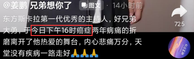 岁末将至,演艺圈却再度传来一则噩耗,知名主持人兼演员傅大勇抗癌失败不幸离世,年仅42岁,令人唏嘘不已!事后,歌手姜鹏悲痛发文悼念证实好友的死讯,并透露“好兄弟大勇于今日(30)下午4点患癌两年、不敌病魔离世,永远地离开了他热爱的舞台,愿一路走好”!