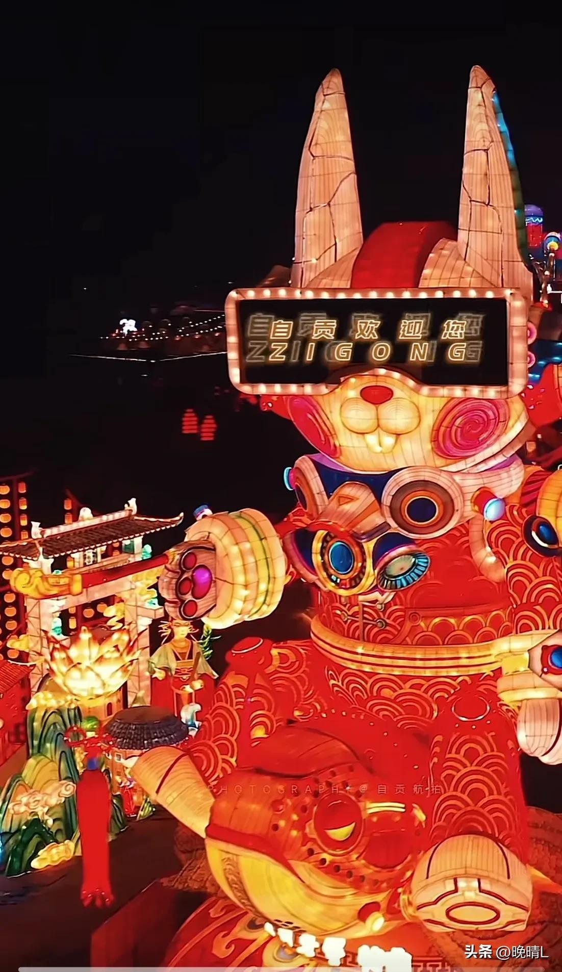 四号:自贡的兔子灯,26米高的“千灯萌兔”,是自贡有史以来最大的一只兔子, 它是用瓷器扎成的,它的身体,手部,头部,腿部都是可以动的,真的好酷啊,有点赛博朋克风,网友称它为“赛博朋克兔”。